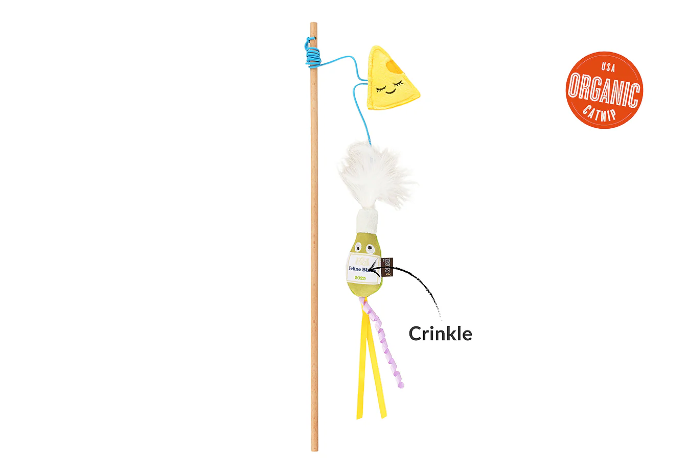 Wine & Cheese Cat Teaser Wand — Interactive Plush Cat Toy with Organic Catnip